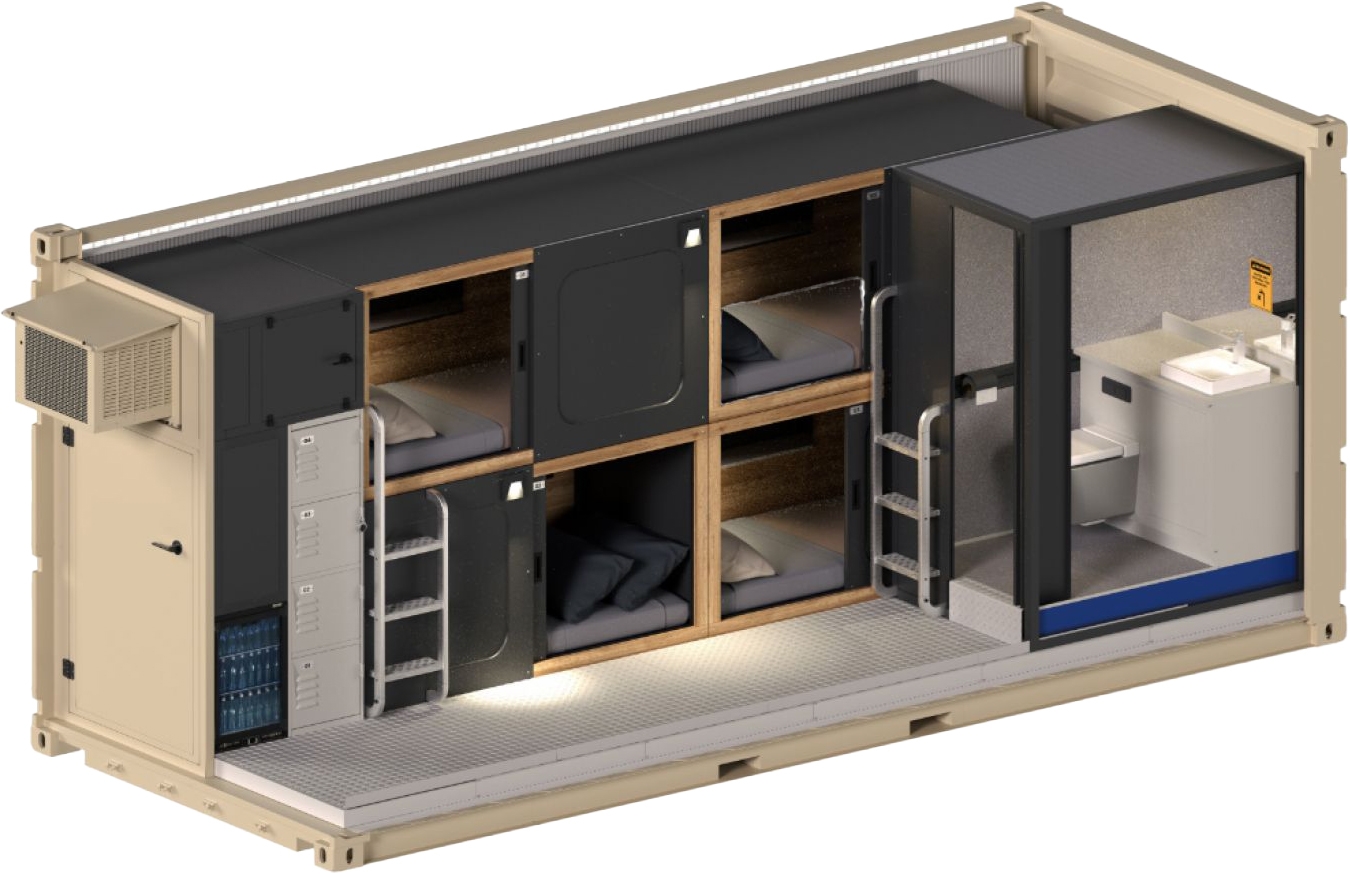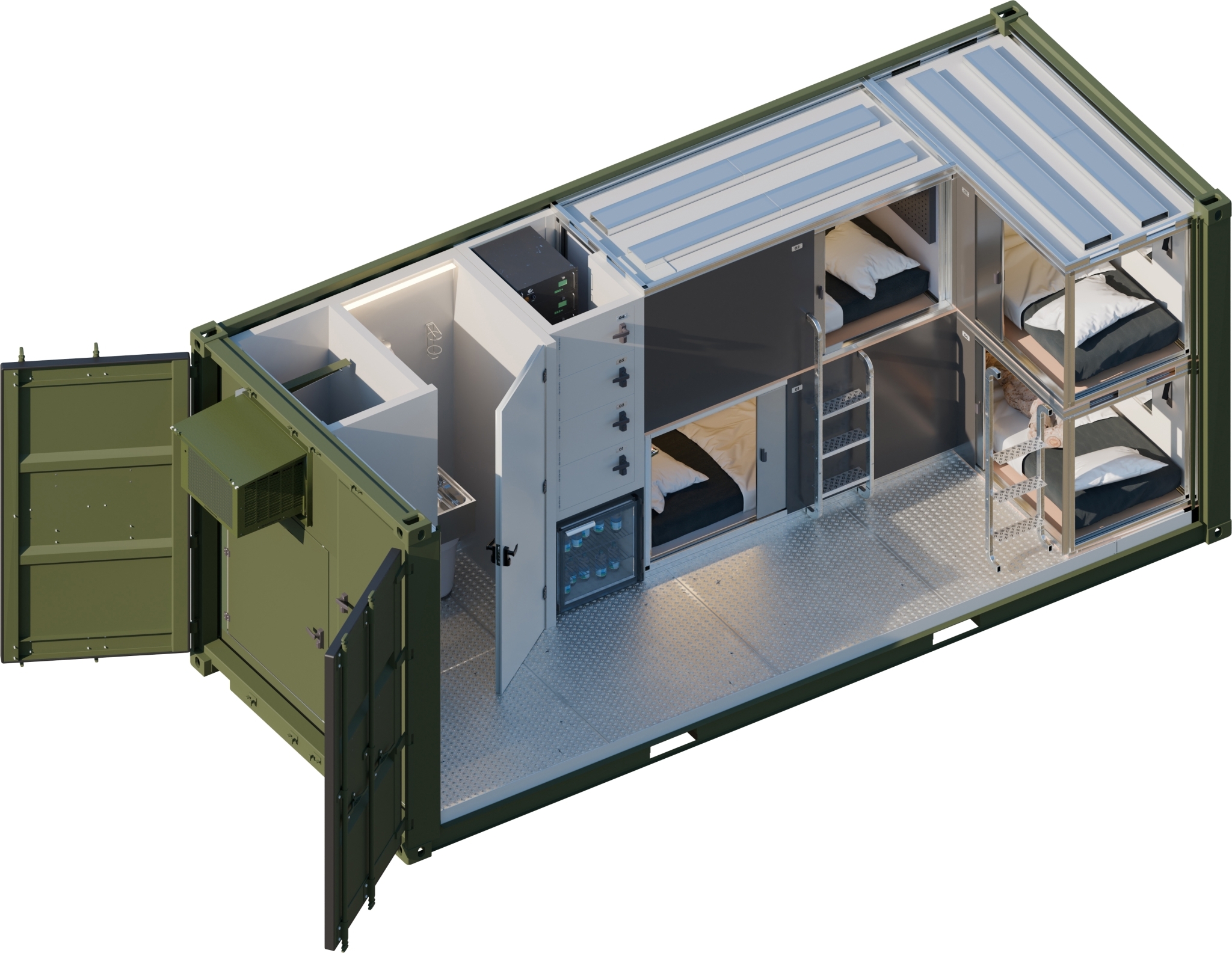 Container-based units with integrated readiness equipment - designed for rapid deployment in crisis situations, disaster response and shelter environments. The pods are available as: