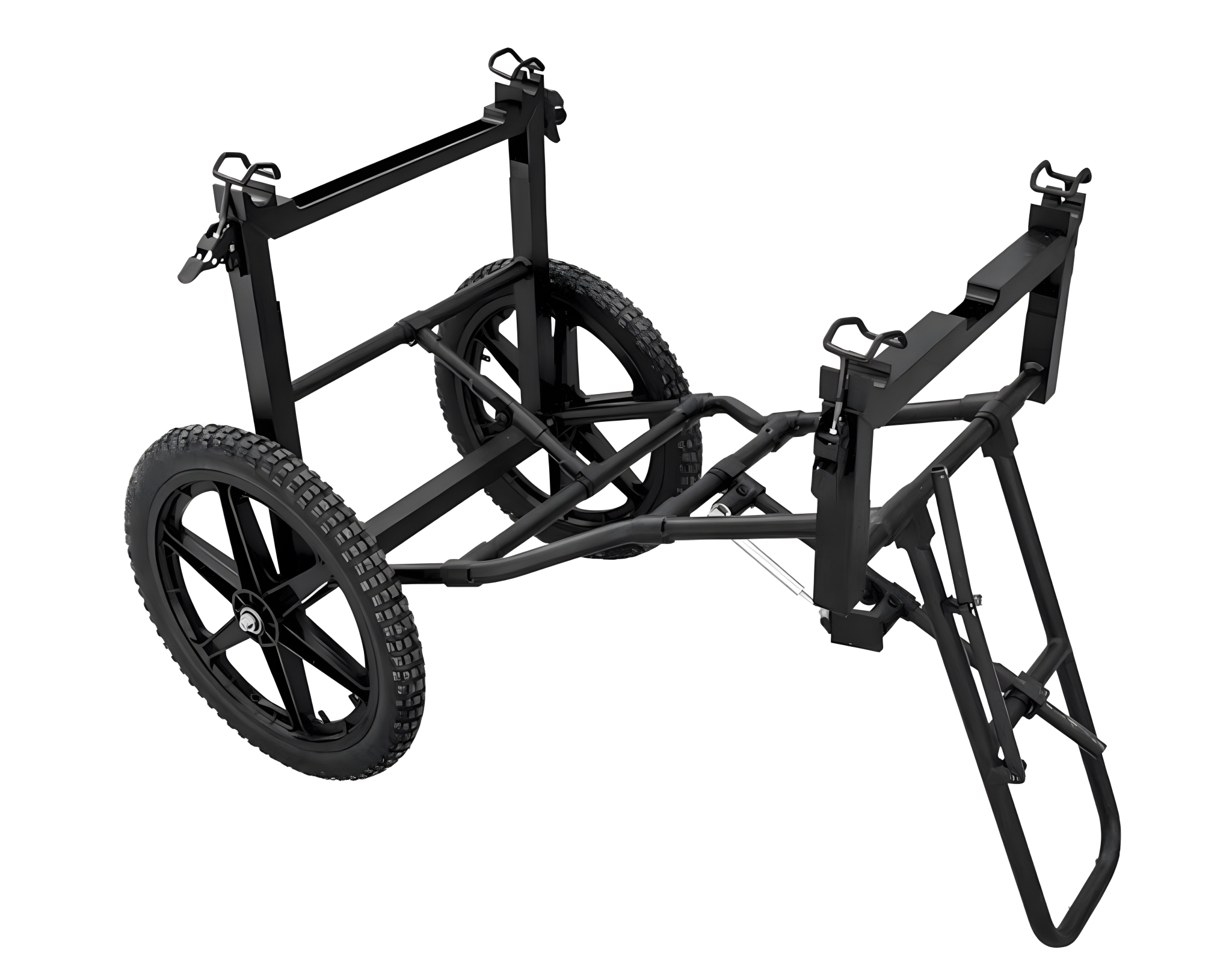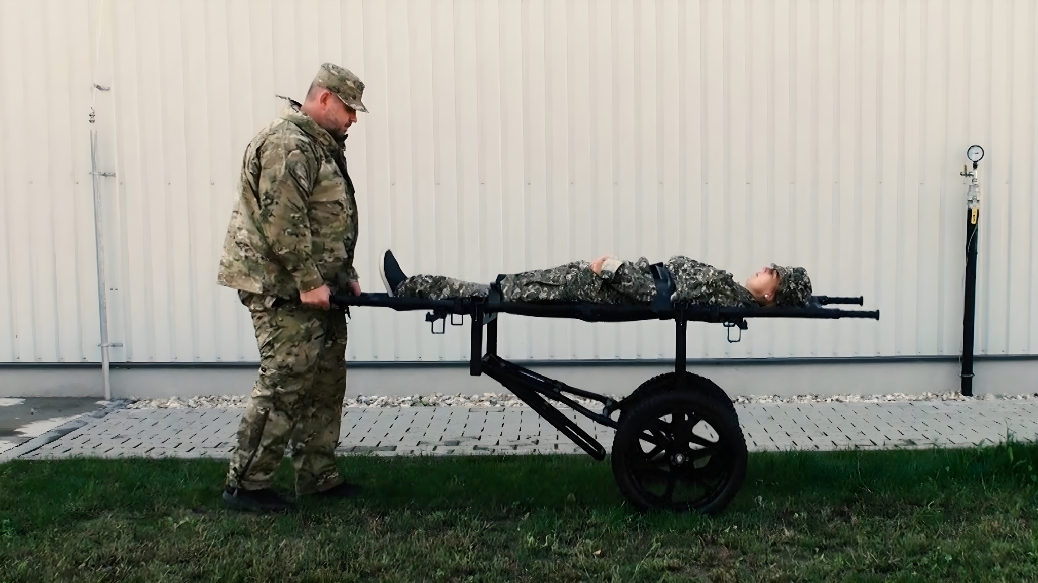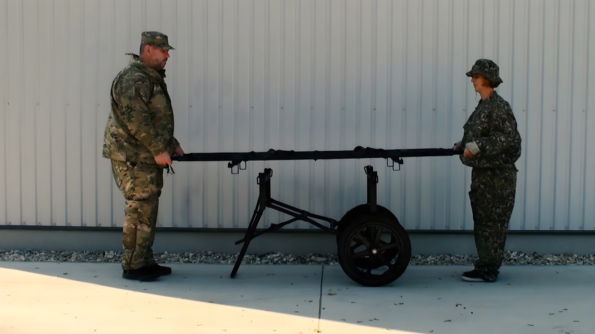 The carrier features a durable foldable aluminium frame that combines strength and low weight, making it easy to transport, deploy, and store. It can be quickly attached to compatible stretchers, allowing one or two operators to move casualties efficiently in field conditions. The large all-terrain wheels provide excellent stability and manoeuvrability on uneven surfaces such as sand, snow, gravel, and rough terrain.