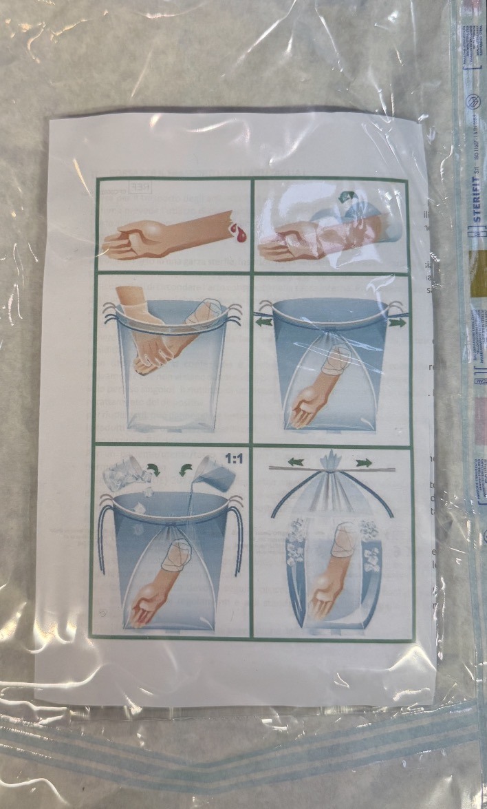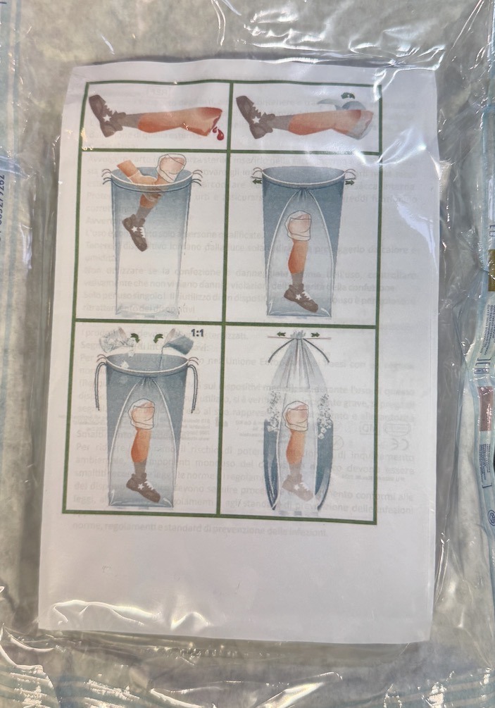 The AMPUTATE BAG is a double-walled bag, consisting of two sterile bags (first inside the second, sealed together) which allows cooling substances between the two bags, without direct contact between coolant and amputate.